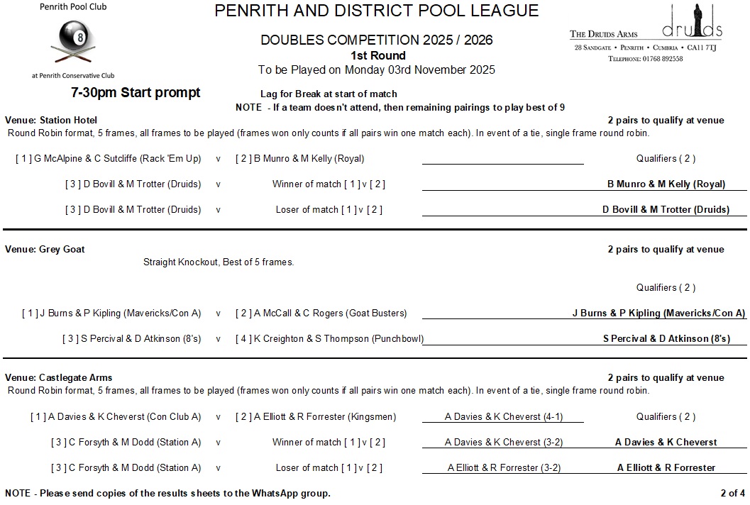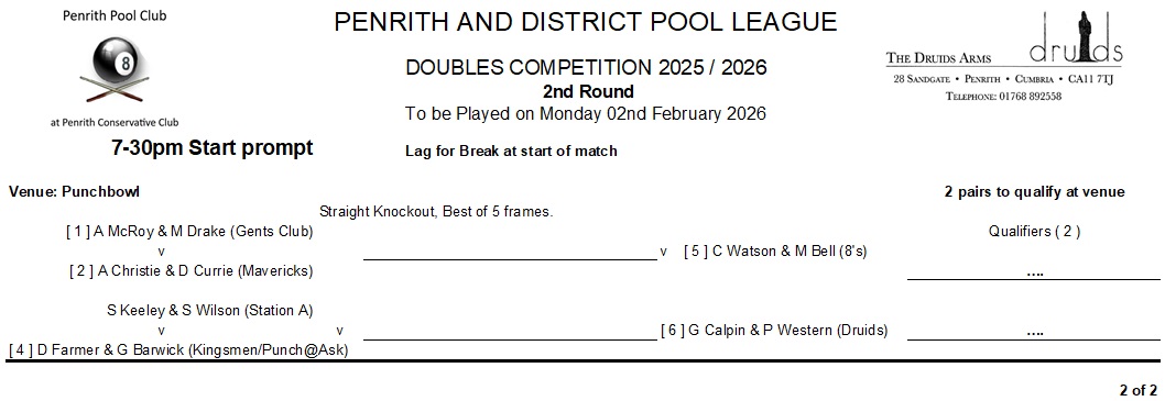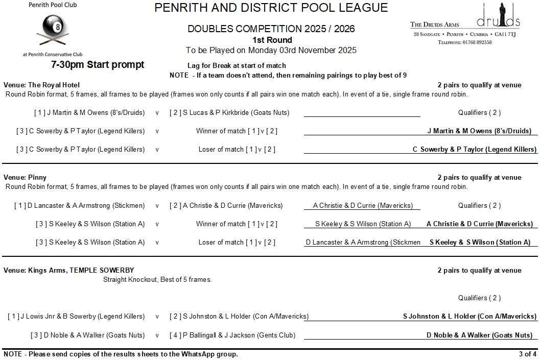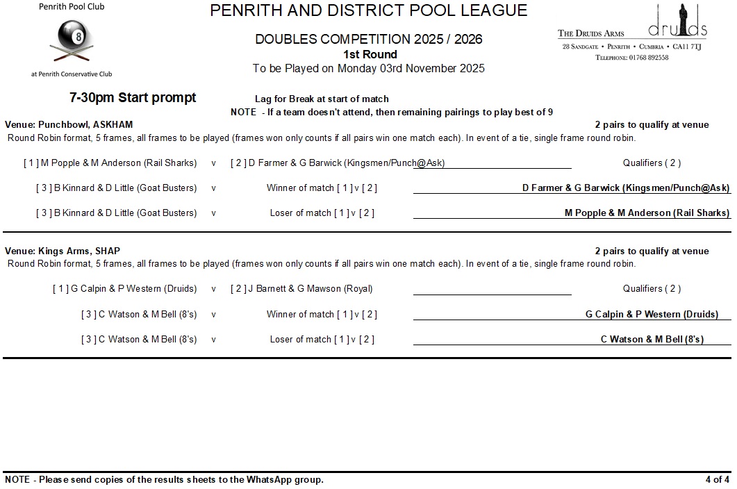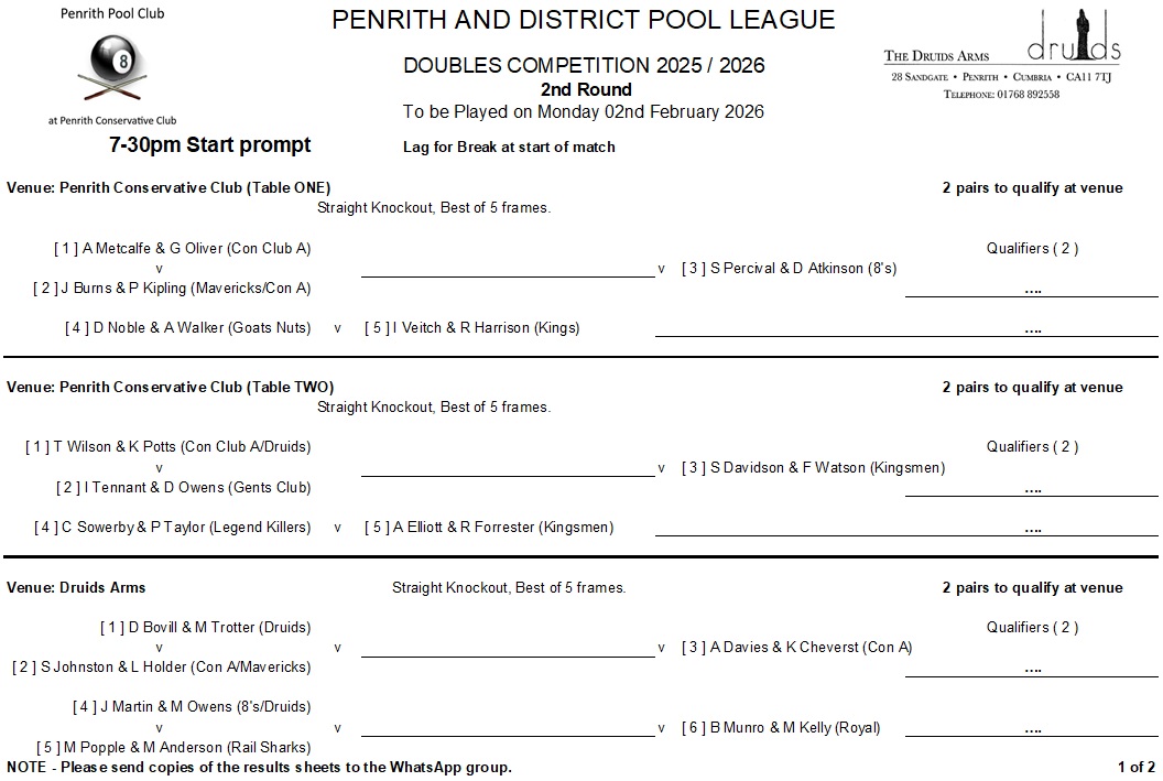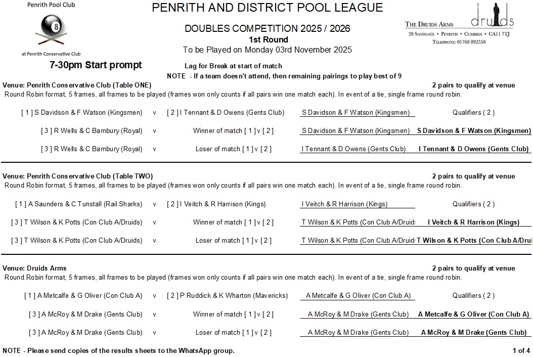 Winter Season 2025-26 Doubles KO competition information …..