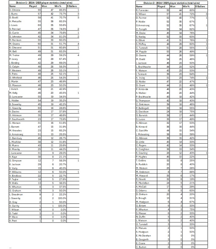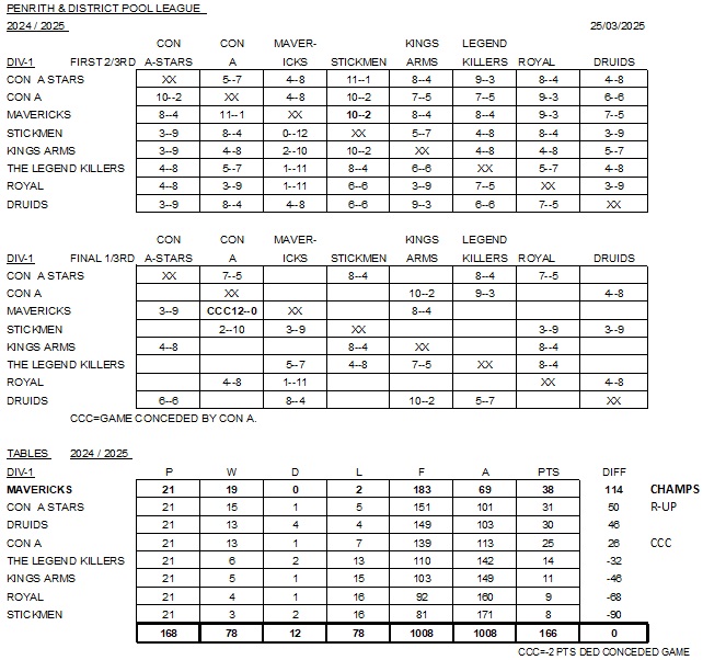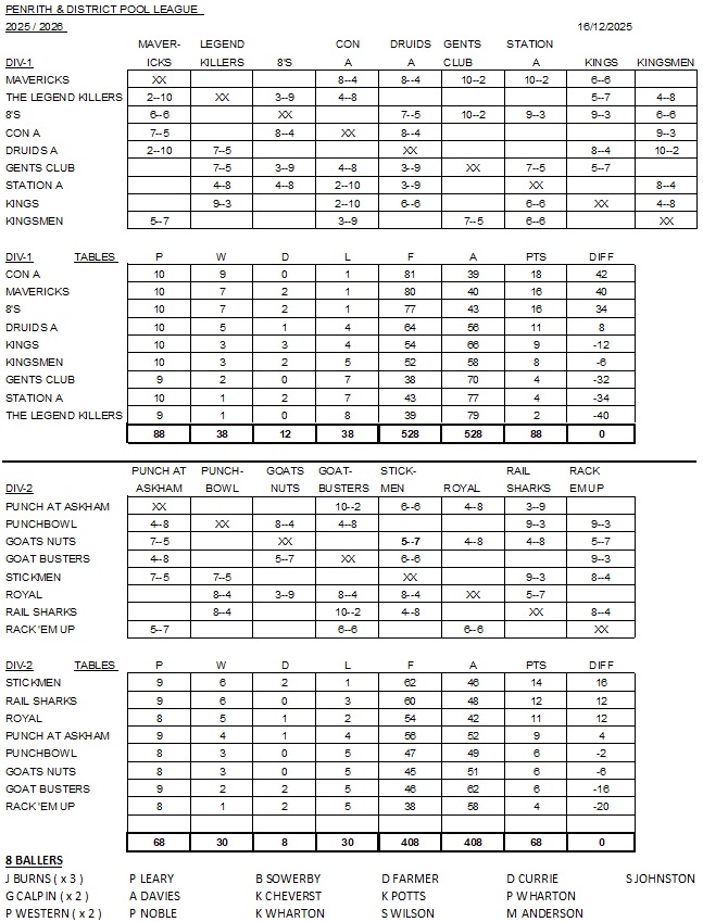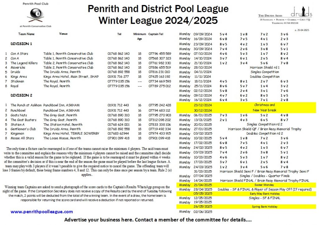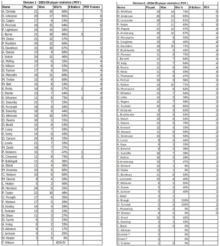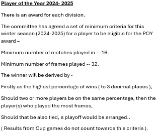 Winter League 2025-2026 – After 11 games ….Winter League 2025-2026 – Player Statistics ( POY ) – After 08 games …Winter League 2025-2026 – FIXTURES ….Winter League 2024-2025 – After 21 games – FINAL STANDINGS ….Winter League 2024-2025 – After 21 games – FINAL STANDINGS ….Winter League 2024-2025 – Player of the Year – Criteria …Winter League 2024-2025 – Player Statistics ( WIN % ) -After 21 games – FINAL …Winter League 2024-2025 – Player Statistics ( Frames WON ) -After 21 games – FINAL…Winter League 2024-2025 – FIXTURES – Rev A ….Winter League 2023-2024 – After 21 games – FINAL STANDINGS…. Winter League 2023-2024 – FIXTURES – Updated – Rev B – 1st Division Only …. Winter League 2023-2024 – FIXTURES – Updated – Rev B – 2nd Division Only ….Winter League 2023-2024 – After 7 games. Winter League 2022-2023 – After 21 games – FINAL STANDINGS. Winter League 2022-2023 – FIXTURES – rev C.. Winter League 2022-2023 – After 16 games. Winter League 2022-2023 – After 14 games.